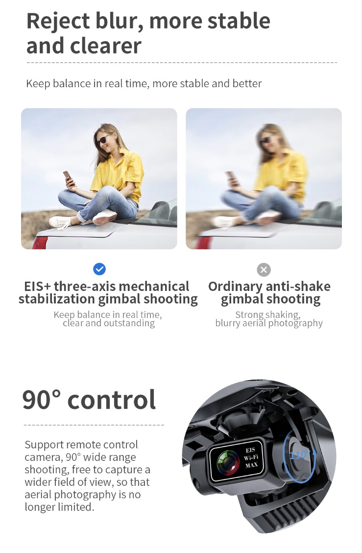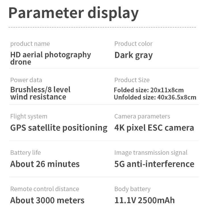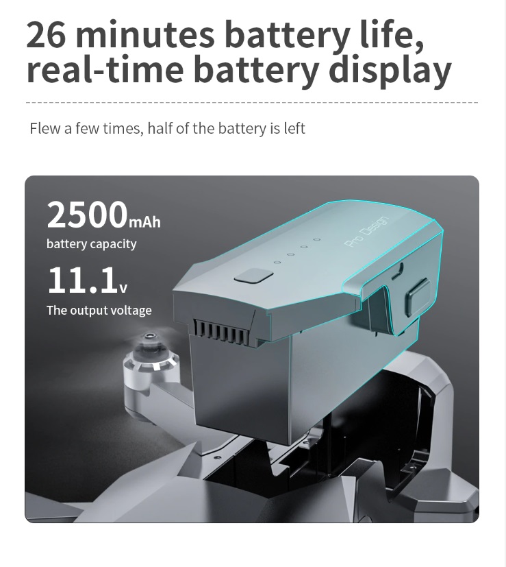 Item No: KF101 MAX Color :Dark Grey Frequency :2.4G (Remote Control) & 5G (Mobile Phone) Drone Battery :11.1V 2500mAh Control Distance : 3KM For KF101 MAX Wifi Image Transmission Distance : 3KM Flight Time : About 25 min Charging Time : About 6 hours USB Charging : 5V/2A Drone Weight : 613g (Needs drone registration in Singapore) Remote Control Battery : 3.7V 1000mAh Transmitter Charging Time : About 60min Transmitter Operating Time : About 10 hours Camera : 3 -Axis Electronic Stabilization Gimbal EIS electronic image stabilization Camera Camera Lens : 120° Photo Resolution (APP) : 3840*2160 P Video Resolution (APP) : 1280*720 P Photo Resolution (SD Card) : 2560*1440 P Video Resolution (SD Card) : 2560*1440 P Frame Rate : 30fps Photo Format : JPG Video Format : MP4 or AVI Adjustable Angle :90° Gesture Shooting : 1-3 M GPS Follow Me : 30 M+ SD Card Supports 32G-128G(Not Included) Mobile Device System Version : iOS 8.0 or later / Android 4.4.4 or later