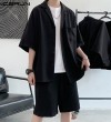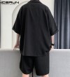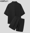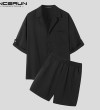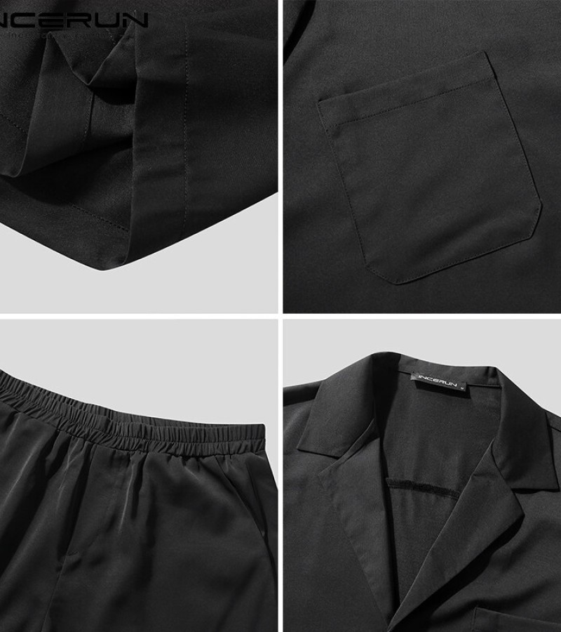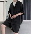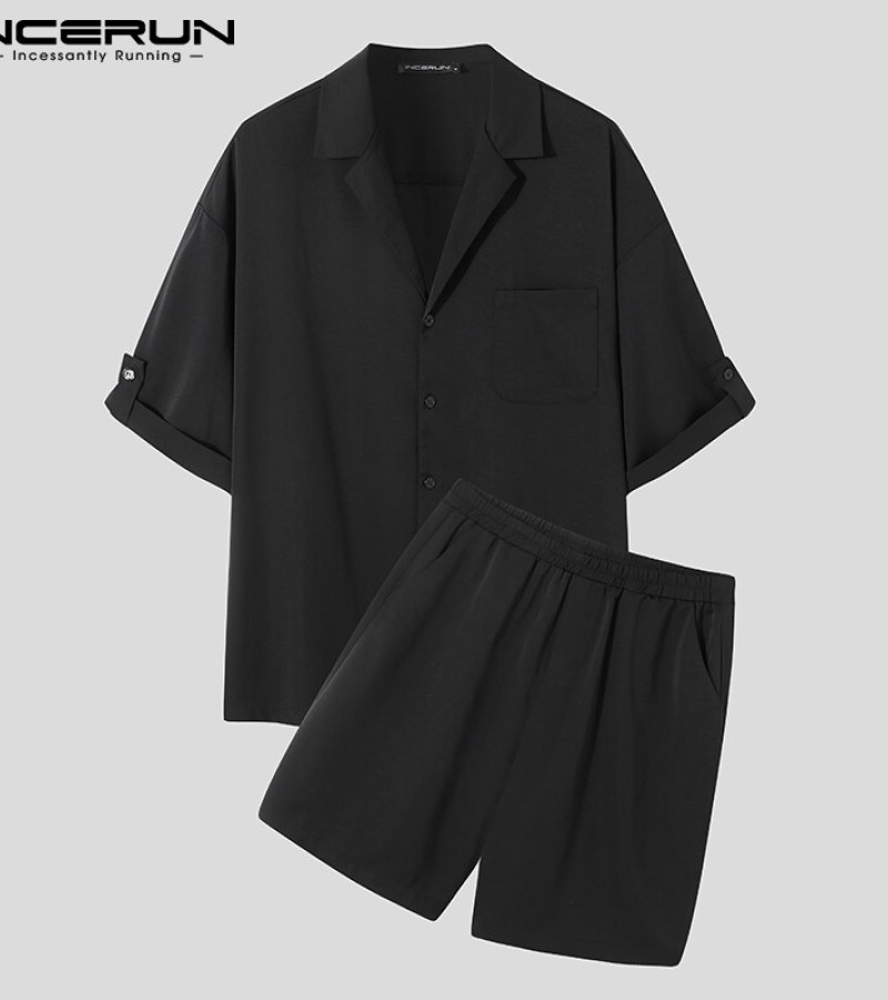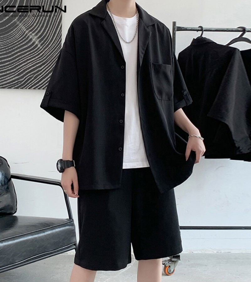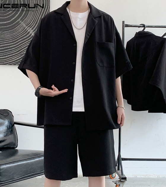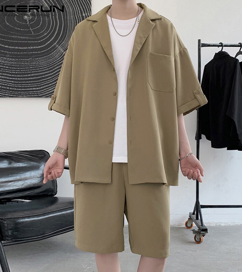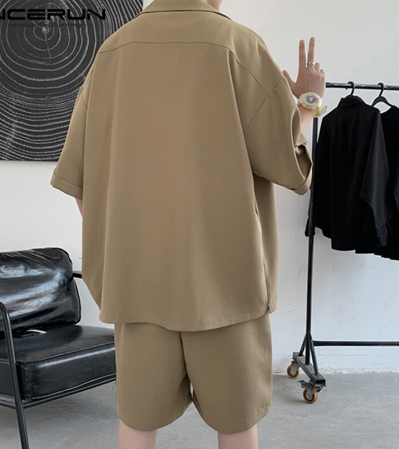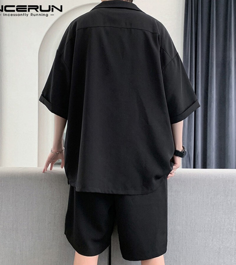 INCERUN男式短袖韩式休闲西装纽扣衬衫弹性腰间短裤套装(韩式)