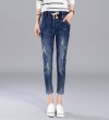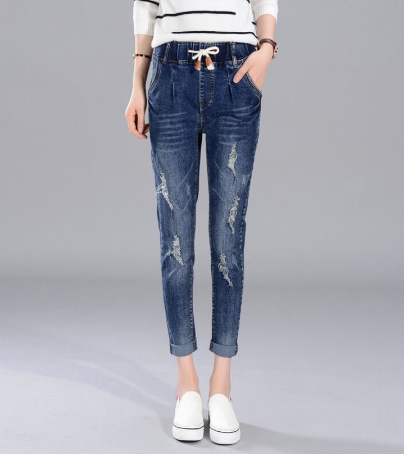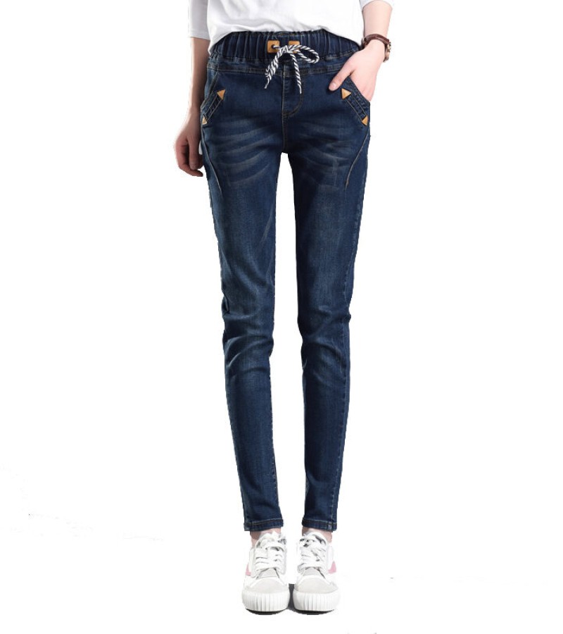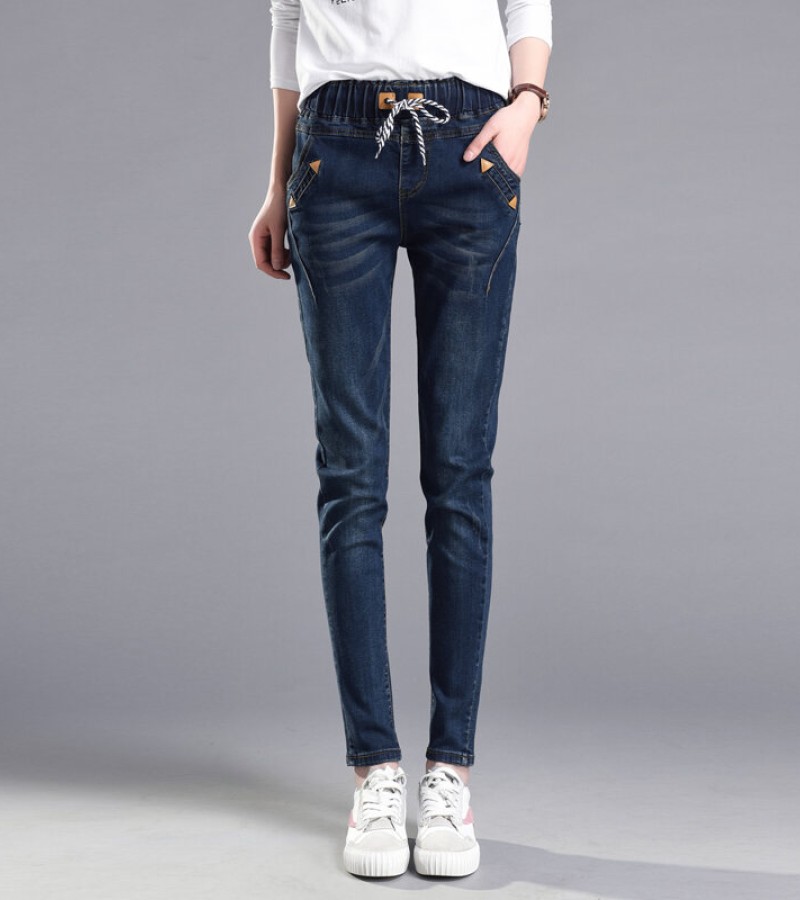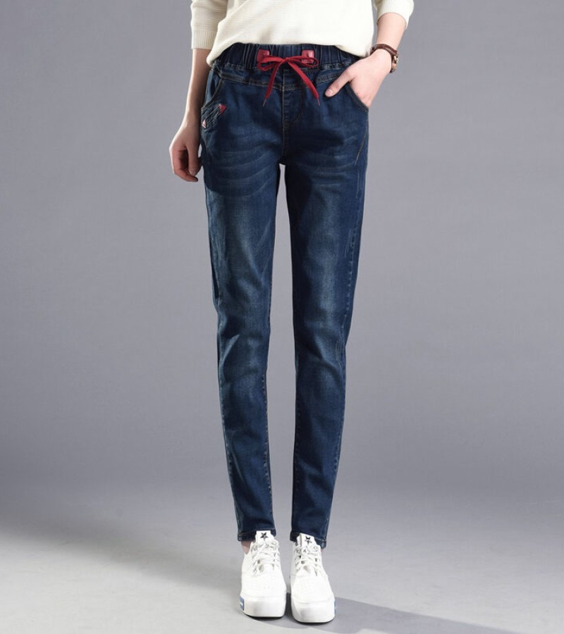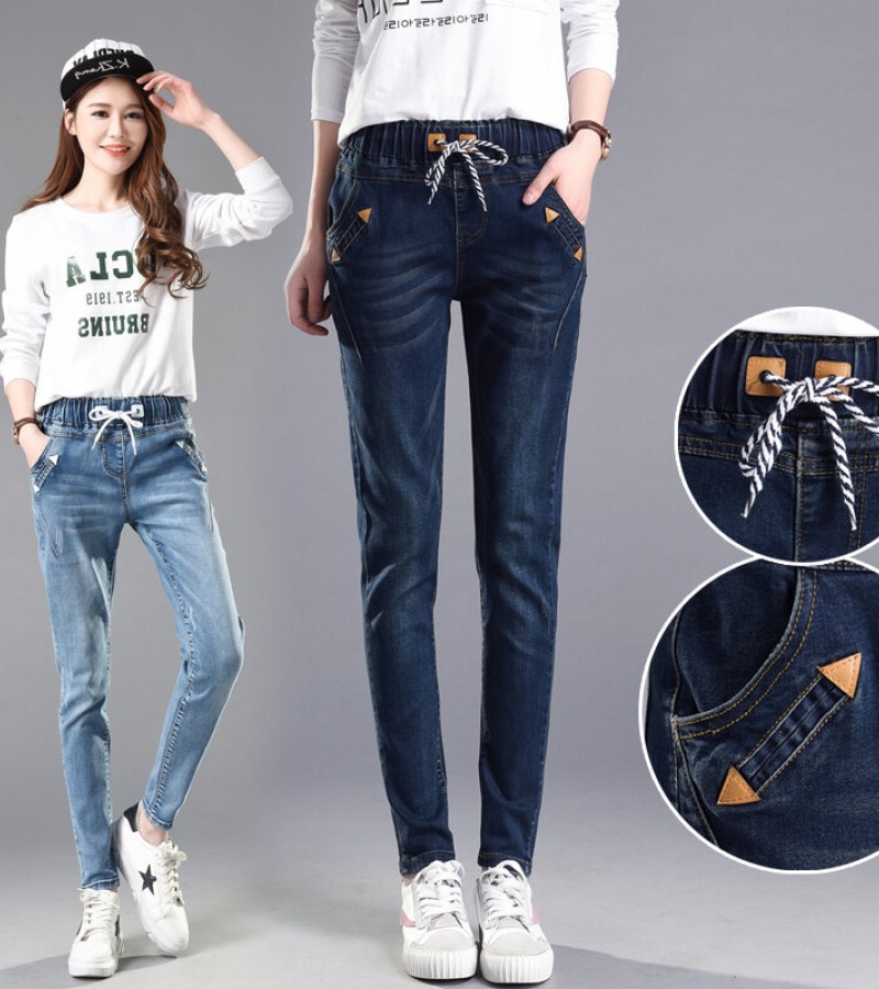 松紧腰高腰牛仔裤女式春秋韩式紧身裤宽松修身裤2021新款哈兰长裤
