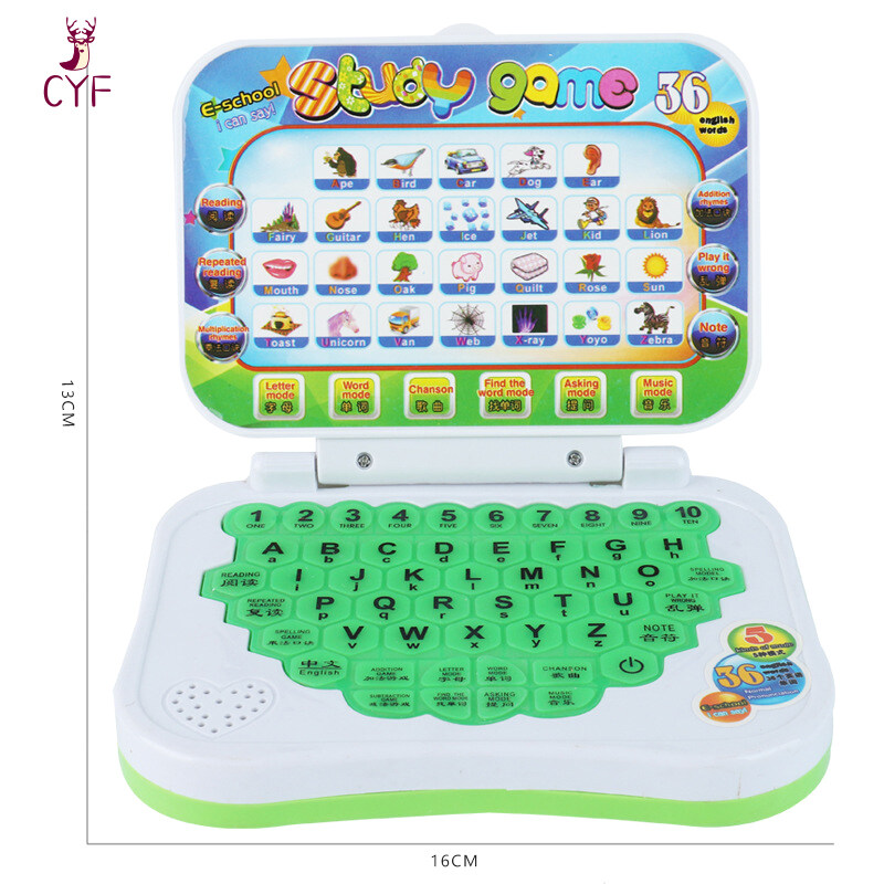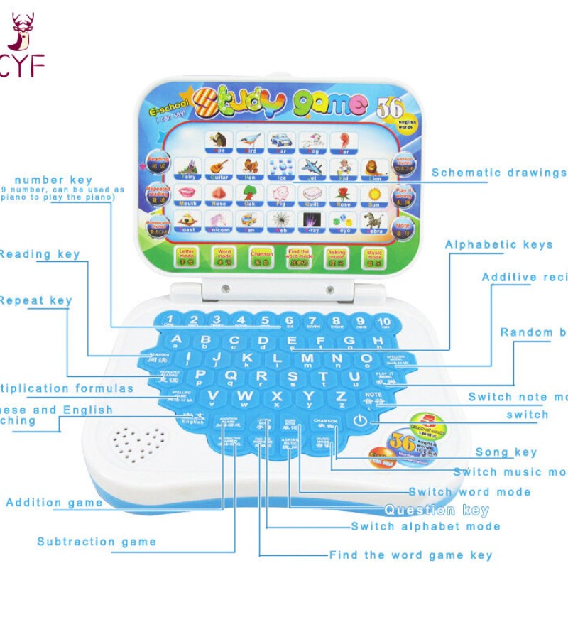 Features: 1.Press the key to start learning. If you press the key after pressing the key, the learning machine will automatically shut down. If you need to use it, you need to press the key again. 2.It has 26 English alphabet keys and 10 numeric keys. Chinese, English learning, can be used as the keyboard of the keyboard, playing music. 3.There are 26 English alphabet keyboards, which correspond to 32 English words and picture knowledge points on the flip cover. When the machine questions, 26 letters are controlled to answer the questions, and after switching, it becomes 26 songs. 4.Fruit and animal prints, click to read in English and Chinese. (Color Random) 5.Chinese mode, English mode, music mode, singing mode, alphabet mode, word mode, spelling mode, and question mode are available for selection.Specification:Item Name: Learning MachineSize: 12x15.5cmFunction: Chinese&English Learning, Preschool educationSuit for: 3+ years older kidColor: RandomPowered By: 3x AA battery(Not Included)Included: 1x laptop