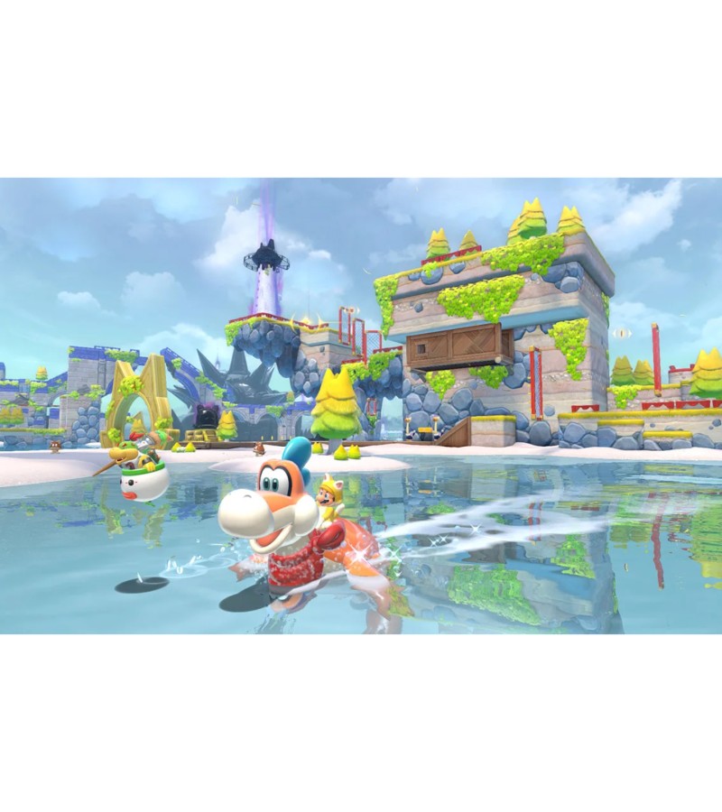 Pounce and climb through dozens of colorful courses! Mario (and his friends) can use a variety of power-ups like the Super Bell, which grants catlike abilities like climbing and scratching. Team up with up to three other players locally* to reach the goal and see who can get a high score. Explore a seamless feline world in the new Bowser’s Fury adventure Free-roaming Super Mario gameplay makes a return in this brand-new adventure. Bowser has become gargantuan and lost all control! Explore Lake Lapcat and its islands, complete objectives to collect Cat Shines, and team up with Bowser Jr. to bring his big, bad dad back to normal. Just watch out for Bowser’s island-wide attacks. New and improved features pounce in The Super Mario 3D World + Bowser’s Fury game features the same great co-op gameplay, creative levels and power-ups as the original game, but with added improvements. In the Super Mario 3D World part of the game, characters move faster and the dash powers up more quickly. Both adventures support the newly added Snapshot Mode—pause the action to get the perfect shot, apply filters, and decorate with stamps!
