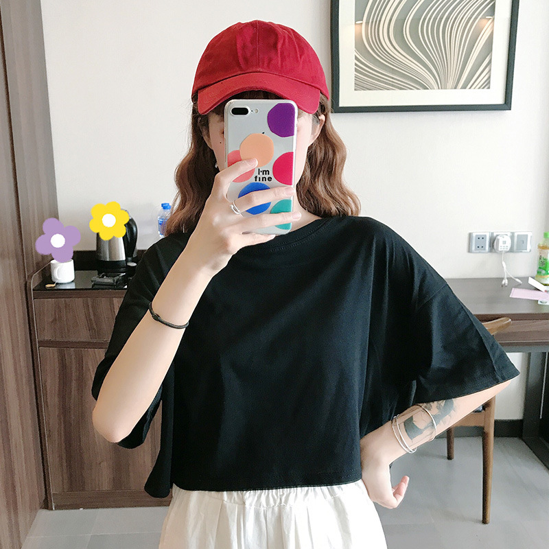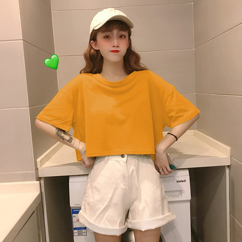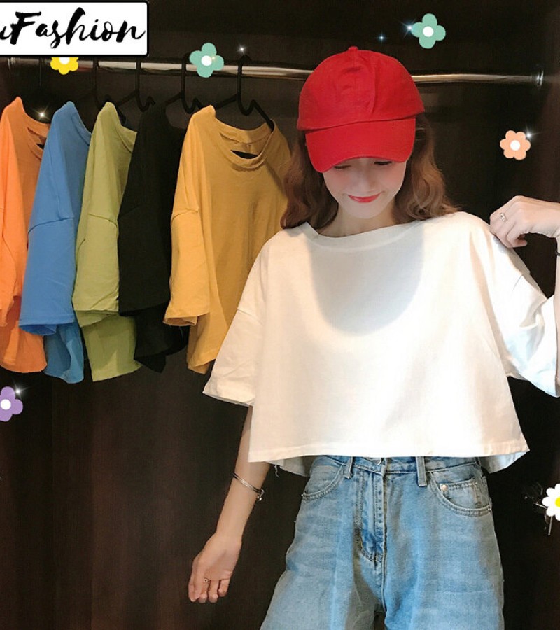 LuFashion女式露脐上衣夏季糖果色短袖素色休闲T恤
