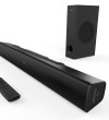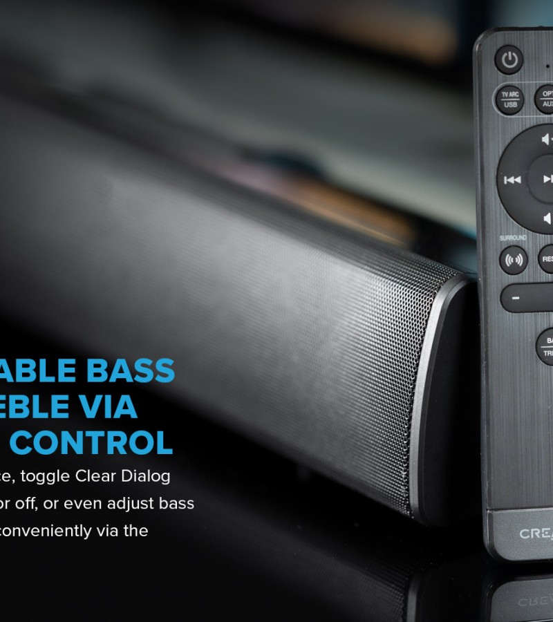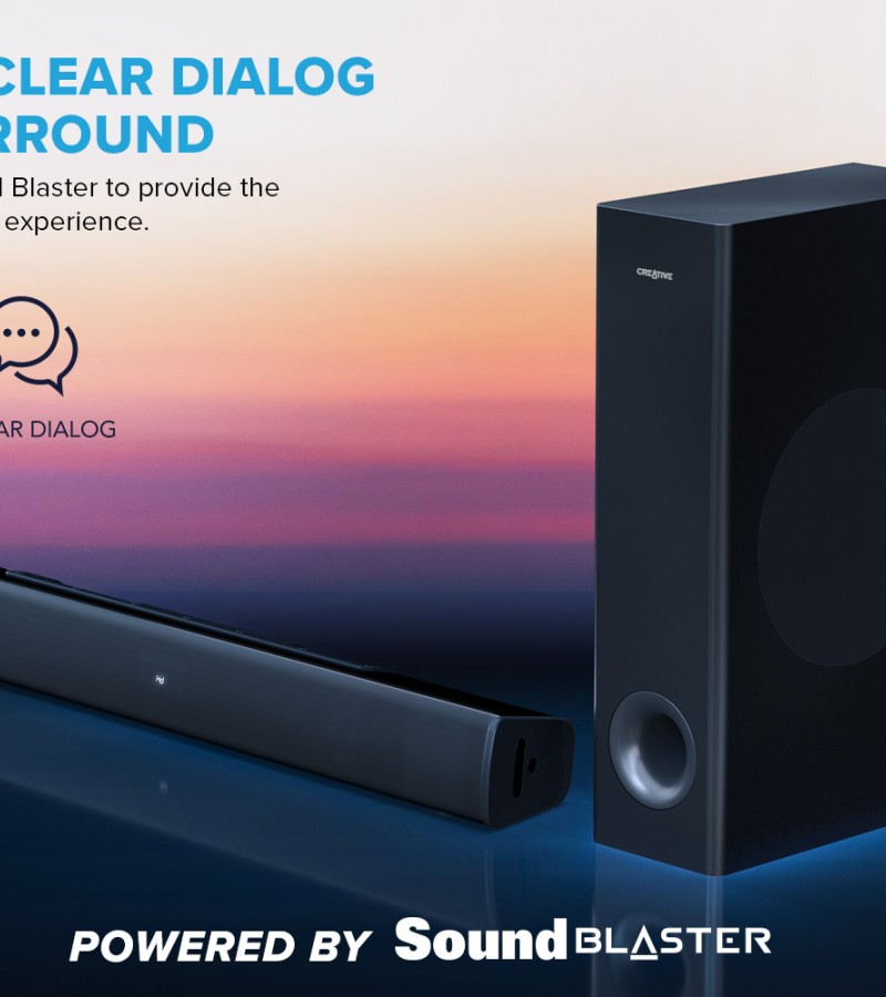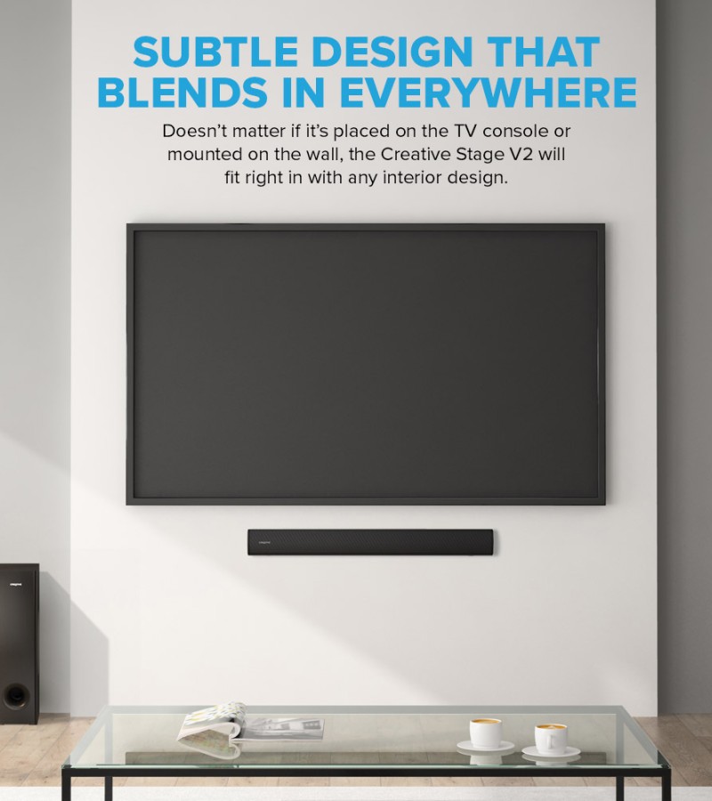 Creative Stage V2-2.1条形音箱,带低音炮、清晰对话和Sound Blaster环绕声、蓝牙5.0、电视ARC、光学和USB音频、壁挂式、可调节低音和高音,适用于电视