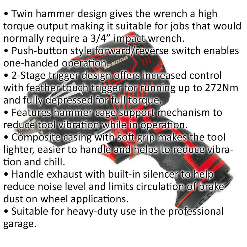 - Twin hammer design gives the wrench a high torque output making it suitable for jobs that would normally require a 3/4" impact wrench.